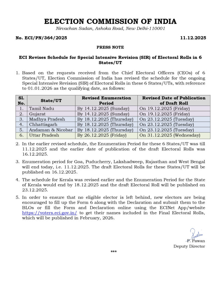 મધ્યપ્રદેશ, છત્તીસગઢ અને આંદામાન-નિકોબાર ટાપુઓમાં અંતિમ તારીખ 18 ડિસેમ્બરથી વધારીને 23 ડિસેમ્બર, 2025 કરવામાં આવી છે.